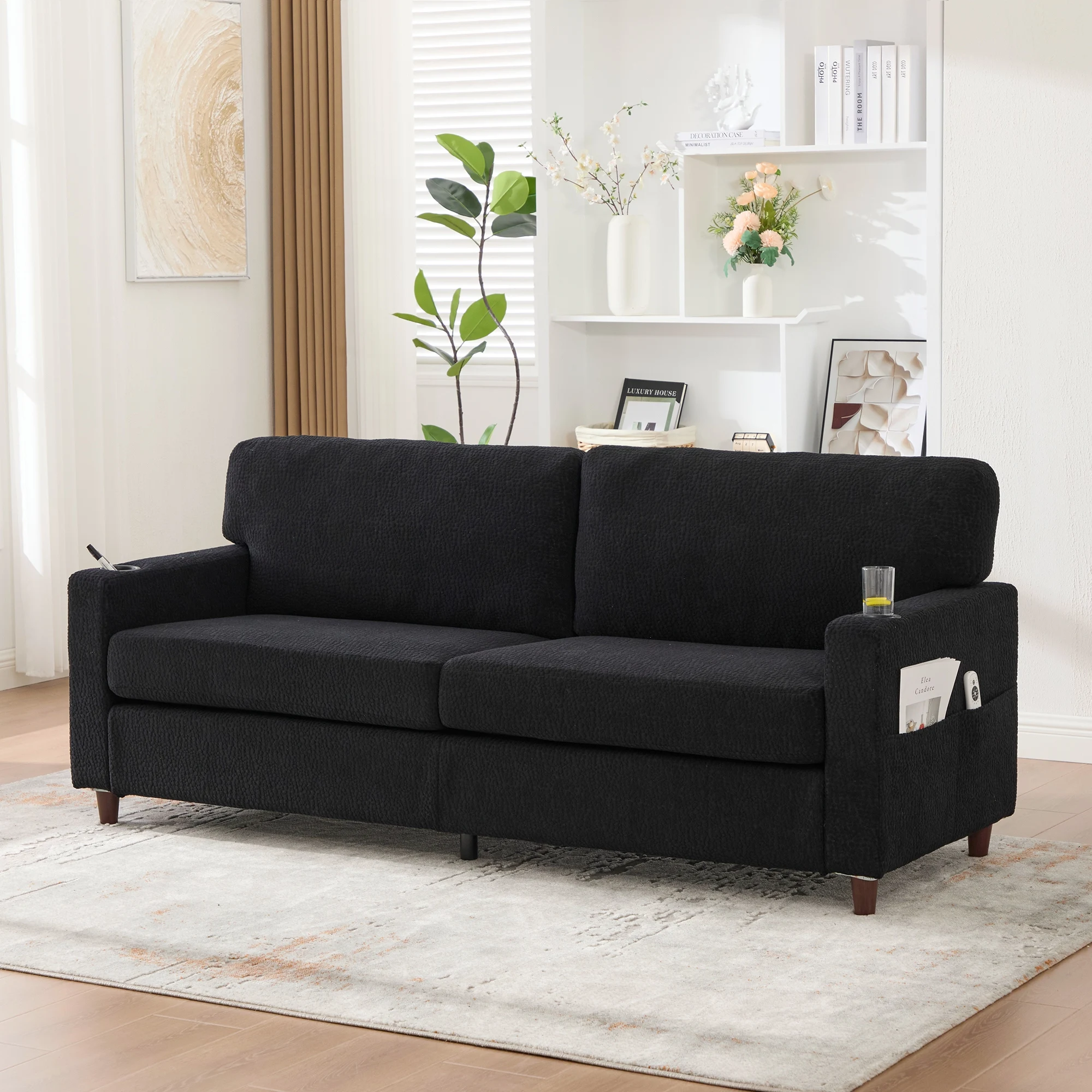 Integrated side pockets with storage function! Perfect for magazines, tablets, or remote controls—a smart organization system built right into the sofa.